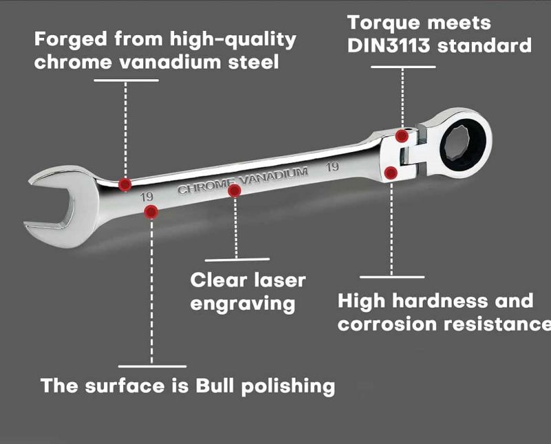 Csúcsminőségű ipari flexibilis fejű racsnis villáskulcs DIN3113 és amerikai szabvány feletti nyomatékkal. Húzza meg vagy lazítsa meg a csavarokat lekerekítés nélkül.